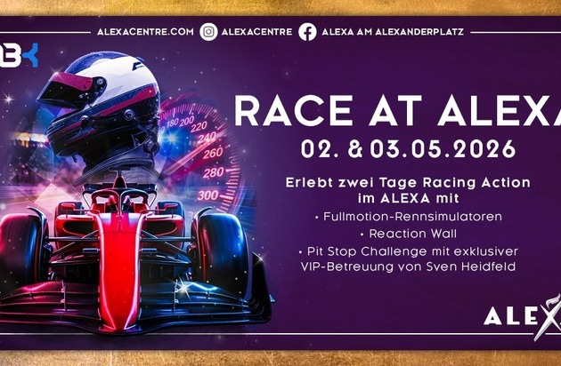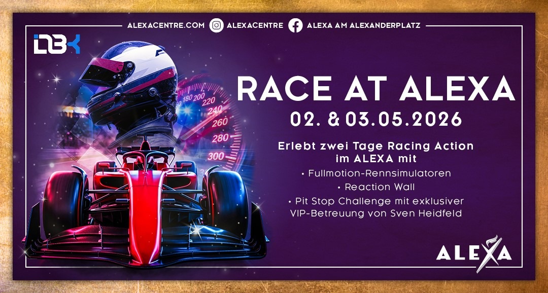 Am ersten Maiwochenende veranstaltet das ALEXA am Alexanderplatz das interaktive Event „Race at ALEXA“ für die ganze Familie rund um das Thema Motorsport. Ob beim virtuellen Fahrspaß an modernen Fullmotion-Rennsimulatoren mit XXL-Gaming-Bildschirmen oder beim Geschicklichkeitstest an der Reaction Wall – im Mittelpunkt stehen die gemeinsamen Erlebnisse für Groß und Klein. Ein besonderes Highlight erwartet die Gäste bei der Pit Stop Challenge: Sven Heidfeld, bekannt aus dem Motorsport, steht für Profi-Tipps bereit und sorgt für echte VIP-Momente. Alle Besucherinnen und Besucher sind herzlich eingeladen, aktiv zu werden und mitzumachen – im Team oder auch gegeneinander. Die Aktion findet am 02. und 03. Mai jeweils von 13 bis 18 Uhr im Erdgeschoss des Centers (vor H&M und Zara) statt.