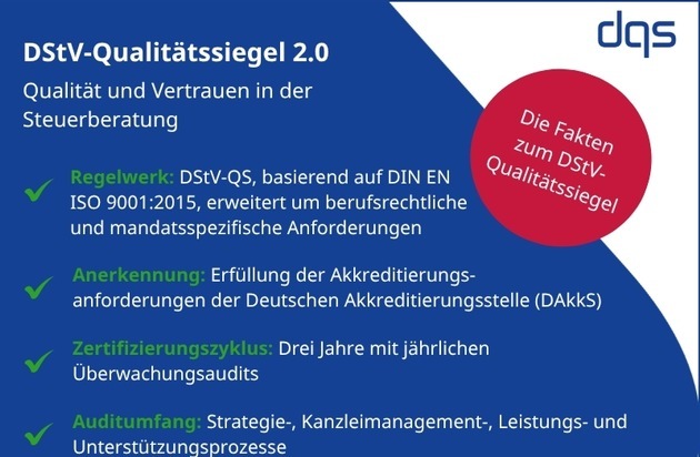 Die Deutsche Gesellschaft zur Zertifizierung von Managementsystemen (DQS) bekräftigt ihre langjährige Partnerschaft mit dem Deutschen Steuerberaterverband e.V. (DStV) und startet die Auditierung und Zertifizierung nach dem weiterentwickelten DStV-Qualitätssiegel. Das überarbeitete Regelwerk kombiniert den spezifisch auf Steuerberatungskanzleien zugeschnittenen Ansatz mit den Anforderungen der internationalen Qualitätsmanagementnorm ISO 9001 und führt so zu einem Plus an Wirksamkeit, Transparenz und Marktakzeptanz. Ein weiteres Plus des DStV-Qualitätssiegels 2.0 ist die Erfüllung der Akkreditierungsanforderungen der Deutschen Akkreditierungsstelle (DAkkS). Damit wird die Qualitätssicherung in Steuerberatungskanzleien auf eine neue, rechtssichere und international anschlussfähige Basis gestellt.