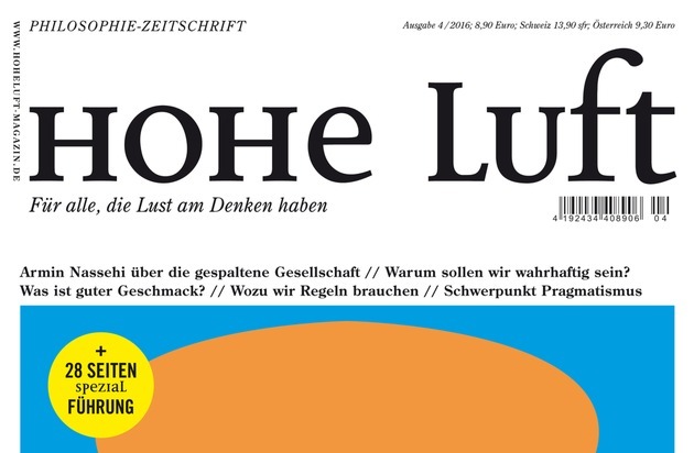 HOHE LUFT betrachtet aktuelle und bewegende Themen aus Gesellschaft & Kultur, Politik & Wirtschaft aus einem philosophischen Blickwinkel und eröffnet dem Leser überraschende Perspektiven auf Grundfragen des Lebens. HOHE LUFT erscheint alle zwei Monate in der HOHE LUFT Verlag UG (haftungsbeschränkt) & Co. KG zu einem Copypreis von 8,90 Euro.