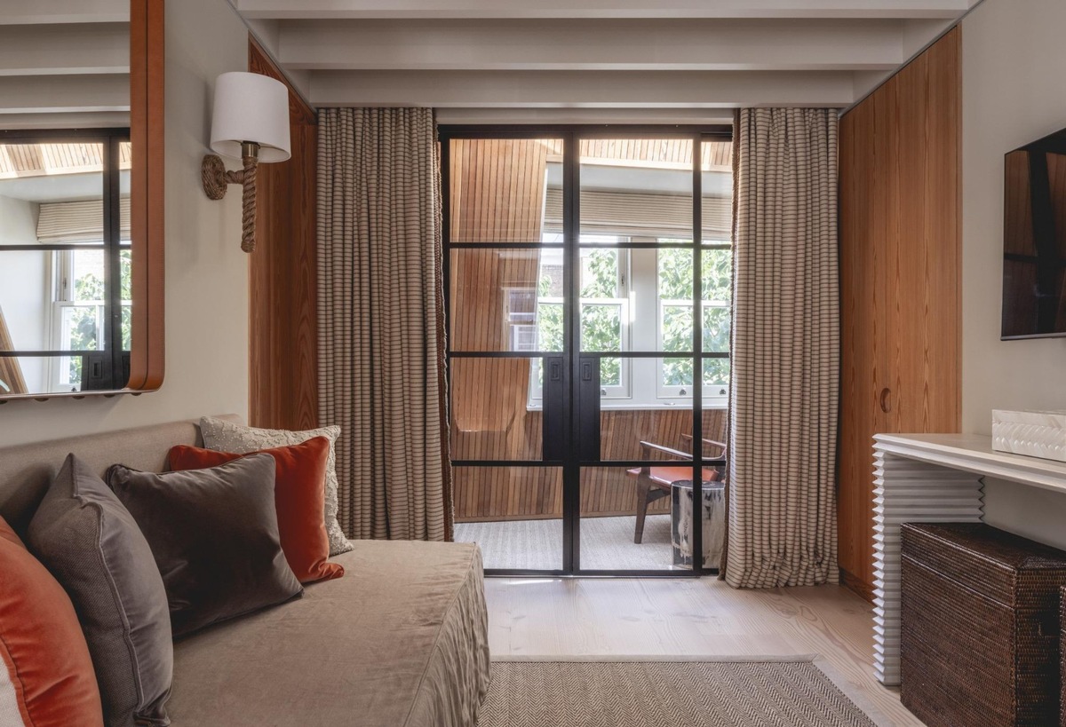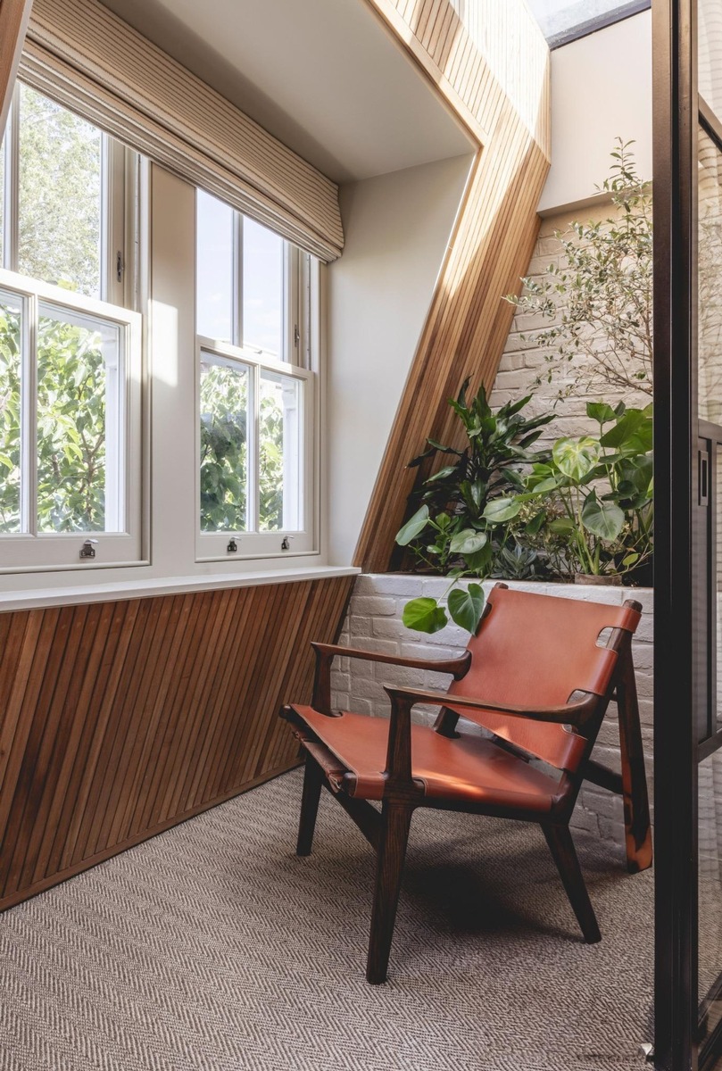 Eine zentral geführte Treppe zieht sich wie eine warme Achse durch alle Etagen und verbindet die Räume zu einer offenen, fließenden Einheit. Breite Dielen aus hellem Douglasienholz, maßgefertigte Einbauten und skandinavisches Mobiliar verleihen den Räumen eine ausgewogene Wirkung. Gemeinsam mit den Bauherren, einem dänisch-britischen Paar, entwickelte Neil Dusheiko Architects jedes Detail – von den Möbeln bis zu den Oberflächen. So verbindet der Entwurf nordische Schlichtheit mit britischer Handwerkstradition.