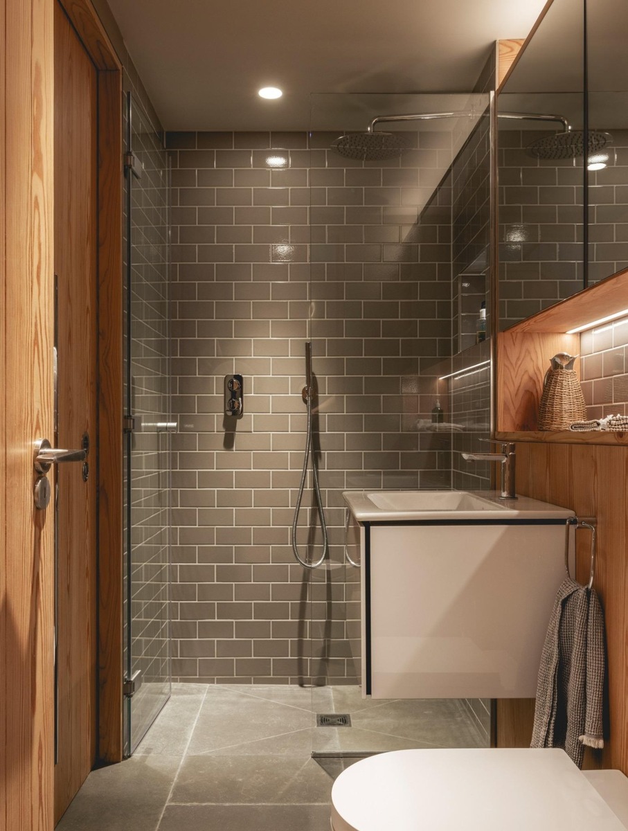 Wie in den Wohnräumen entsteht die Atmosphäre der Bäder aus dem Zusammenspiel von gezielter Lichtführung und sorgfältig aufeinander abgestimmten Materialien. Im Erdgeschoss setzt das Bad auf klare Linien von Duravit: Ein Waschtisch aus ME by Starck mit L-Cube Unterbau und das passende Wand-WC bilden ein harmonisches Ensemble. Das reduzierte Design greift die architektonische Formsprache auf und fügt sich selbstverständlich in das Gesamtbild ein. Helles Holz, präzise gearbeitete Fugen und matte Fliesen unterstreichen die unaufdringliche Eleganz des Raumes.