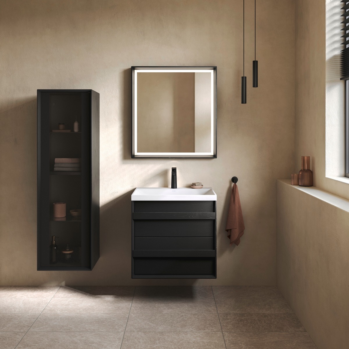 Zur Auswahl stehen Waschtischunterschränke, die sich wahlweise mit dem Keramikwaschtisch ME by Starck oder dem samtig-matten Vitrium-Waschtisch aus Mineralguss kombinieren lassen. Eine Konsolenlösung für Aufsatzbecken eröffnet zusätzlichen Spielraum in der Planung. Ein passender Halbhochschrank wahlweise mit Massivholz- oder Glastüre schafft nicht nur praktischen Stauraum, sondern auch stilvolle Akzente. Spiegel und Spiegelschränke mit massivem Holzrahmen runden das Programm ab und fügen sich stimmig in das Gesamtbild ein. Die integrierte LED-Beleuchtung sorgt für eine gleichmäßige, stimmungsvolle Ausleuchtung.