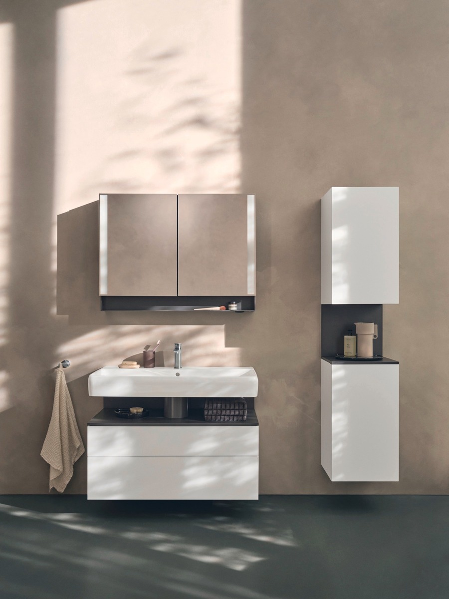 Im Mittelpunkt steht der Waschplatz, der durch seine klare Formensprache und das Zusammenspiel von Weiß und Anthrazit ein markantes Statement setzt. Das großzügige Keramikbecken und die weißen Schubladen werden von einer anthrazitfarbenen Nische durchbrochen, die dem Ensemble Tiefe und Charakter verleiht. Der beleuchtete Spiegelschrank und der Hochschrank mit Koffertür führen diese Logik konsequent fort: Innen sorgen sie für Ordnung, außen setzt eine vertikale Nische in Anthrazit einen klaren tonalen Gegenpunkt.