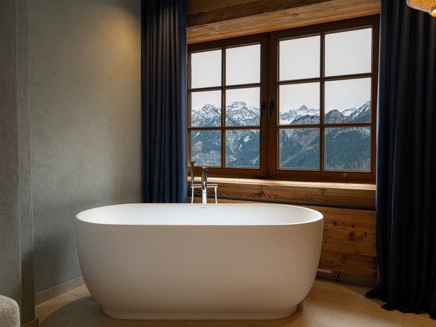 Neben dem Blick auf Schloss Neuschwanstein hat uns vor allem der Felsen inspiriert, auf dem die Blaue Burg steht, insbesondere seine Struktur und Beständigkeit. Diesen Kontrast wollten wir in der Badgestaltung aufnehmen. Die freistehenden Badewannen setzen weiche, klare Formen dagegen und schaffen Leichtigkeit und Ruhe. Die Bäder verstehen wir als Rückzugsorte, in denen Natur, Architektur und Funktionalität zu einer ruhigen Einheit verschmelzen.