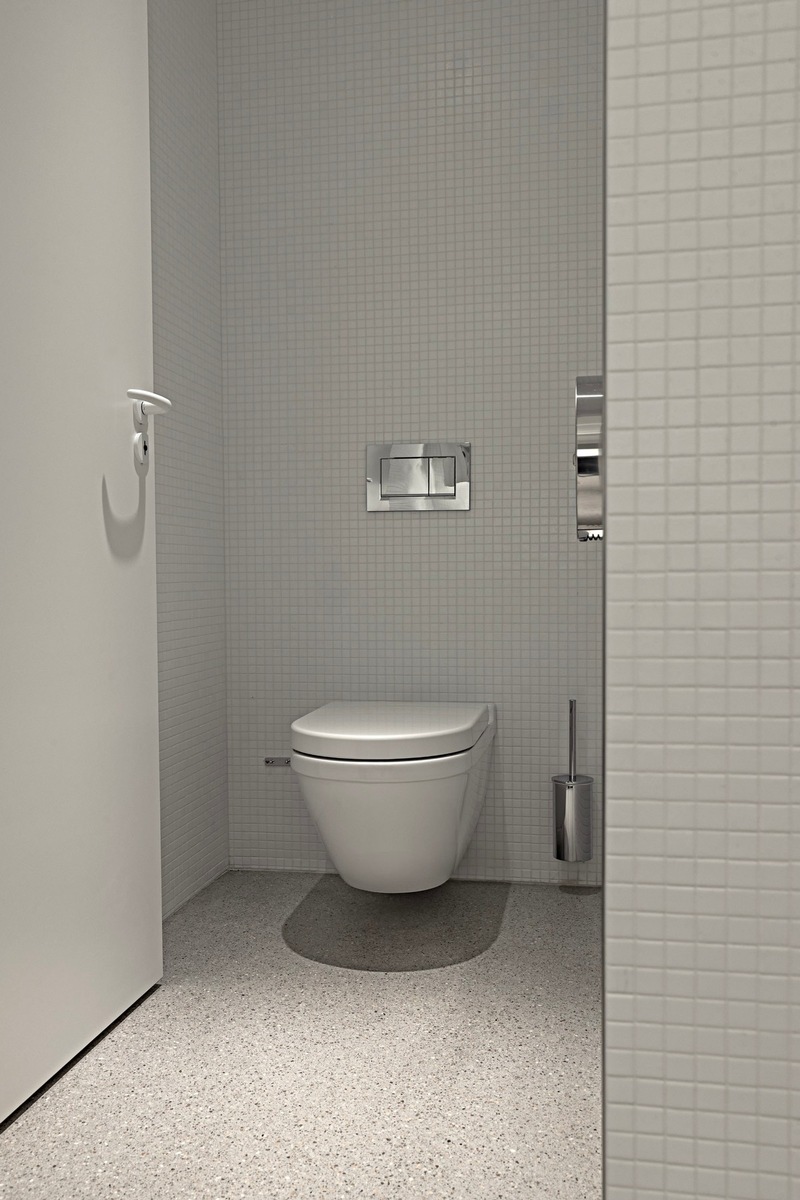 In den Sanitärzonen finden sich Wand-WCs der Serie Starck 3 von Duravit, ergänzt durch barrierefreie Varianten der Vital-Version mit größerer Ausladung. Die zurückhaltende Gestaltung der Serie fügt sich unaufdringlich in das architektonische Gesamtbild ein und eignet sich für stark frequentierte, öffentlich zugängliche Bereiche.