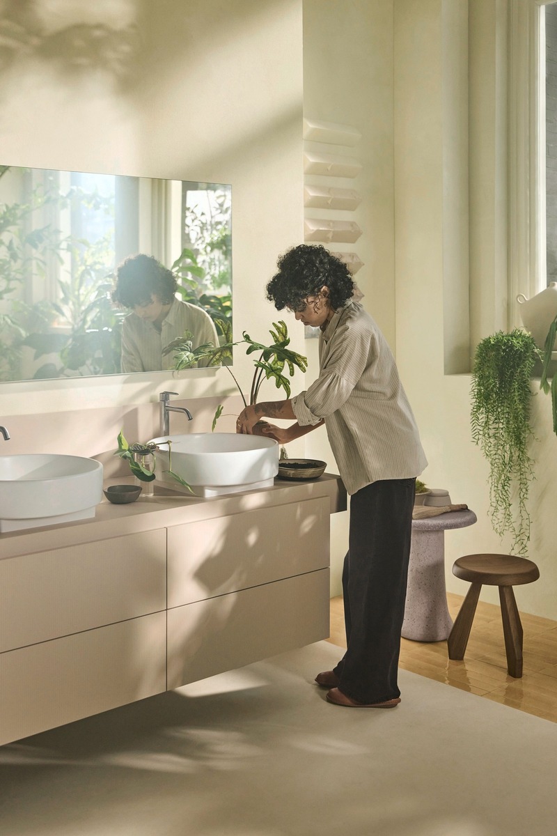 Die Badlösungen von Duravit greifen den naturbezogenen Ansatz auf: mit klarer Formensprache, feinen Proportionen und sanften Farbtönen. Sie fügen sich selbstverständlich in unterschiedliche Gestaltungskonzepte ein und bieten eine perfekte Bühne. In Verbindung mit Tageslicht, hellen Wandflächen und offenen Möbelstrukturen entsteht ein Raum, in dem Pflanzen ihre volle Wirkung entfalten können und der somit an atmosphärischer Qualität gewinnt.