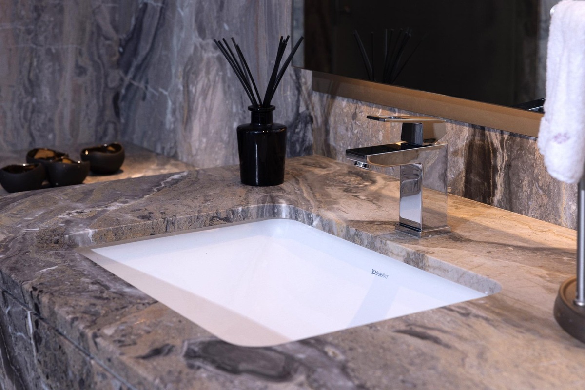 In den Bädern bestimmen großformatige Natursteinflächen mit markanter Maserung den Raum. Breite Waschtischplatten nehmen eingelassene Einbauwaschtische auf. Indirekt beleuchtete Nischen, lineare Spiegel und dunkle Holzfronten ergänzen die mineralische Materialpalette. Mit Serien wie ME by Starck, Starck 1 und Starck 3 sowie dem Dusch-WC SensoWash® integriert Duravit präzise gestaltete Keramik in das Badkonzept. Sie bildet einen ruhigen Kontrast zu den lebhaften Steinoberflächen.