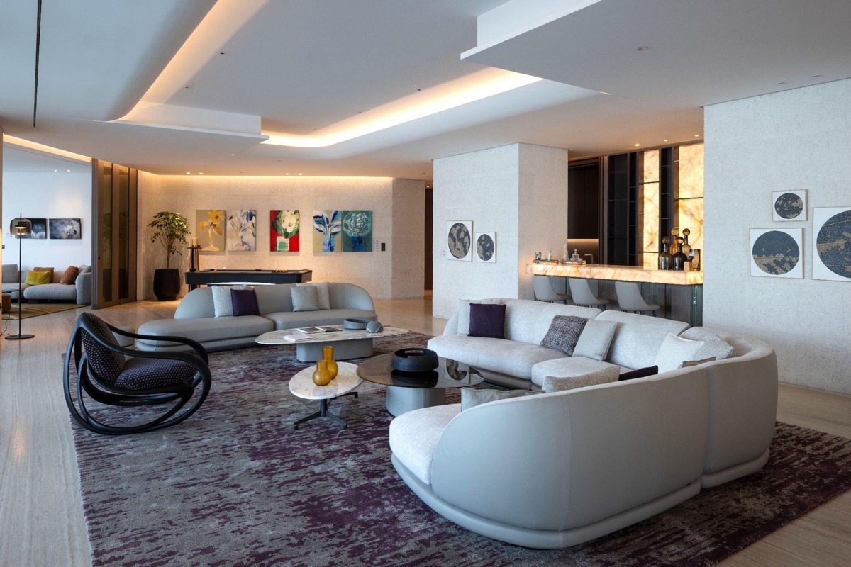 Studio Lipparini und Saporiti Italia übersetzen die architektonische Klarheit der Türme in ein ruhiges, materialbetontes Interior. Großformatige Natursteinböden, helle Kalksteinwände und dunkle Holzpaneele strukturieren die offenen Wohnbereiche. Eine reduzierte Farbpalette aus Creme-, Sand- und Grautönen bildet den Hintergrund für maßgefertigte Einbauten und ausgewählte Designmöbel. Textile Akzente und weich gepolsterte Sitzlandschaften bringen zusätzliche Wärme in die klar komponierten Räume.