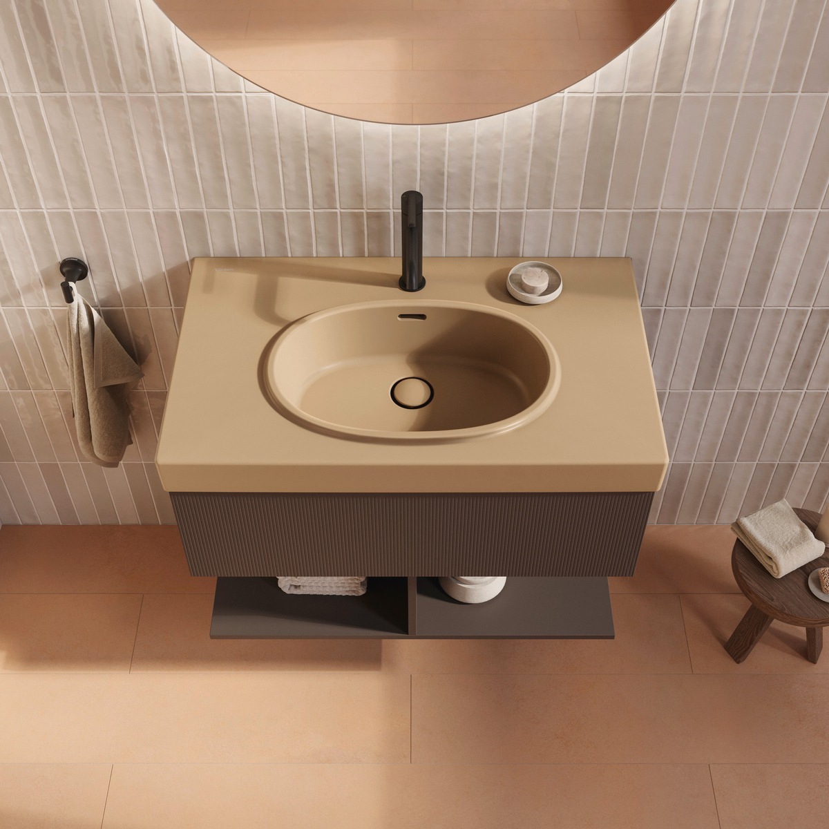 Für Duravit exklusiv von Patricia Urquiola gestaltet, übersetzt Balcoon-Scapes die charakteristische Formensprache von Balcoon in einen räumlich inszenierten Kontext. Die Installation abstrahiert die charakteristischen runden und quadratischen Grundformen, die Überlagerungen von Materialien und Texturen sowie die warmen, erdigen Farbstimmungen der Serie zu einem skulpturalen Feld aus Objekten. Waschbecken und bodenstehende WCs werden aus ihrer funktionalen Orientierung gelöst und als totemartige Elemente inszeniert. Zwei eigens gefertigte Toiletten mit außergewöhnlichen Oberflächen – die eine in einer fellartigen Textur, die andere mit einer strukturierten Betonschicht – setzen einen unerwarteten Akzent im Raum und verleihen der Installation eine spielerische Note.
