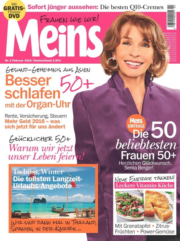 Die neue Generation der Frauen 50plus verfügt über so viel Power und Lebenslust wie nie zuvor. An diese Frauen richtet sich die Zeitschrift Meins, die zusammen mit dem Marktforschungsinstitut TNS Emnid die beliebtesten 50 Frauen 50plus ermittelt hat: Schauspielerin Senta Berger (74) siegt vor Iris Berben (65) und Hannelore Elsner (72). Mit gerade 50 Jahren landen Veronica Ferres und Anke Engelke auf den Plätzen fünf und sechs. Die Bundeskanzlerin sichert sich die beste Platzierung unter den Politikerinnen 50plus und erreicht im Gesamtranking Platz 15. "Dass Senta Berger bei den über 50-Jährigen in Deutschland am beliebtesten ist, freut uns ganz besonders. Sie ist eine absolute Power-Frau und genau so, wie sich die Meins-Leserinnen fühlen: schön, klug und voller Energie. Die Umfrage bestätigt einmal mehr, dass Attraktivität keine Frage des Alters ist", erklärt Meins-Chefredakteurin Sabine Ingwersen.
