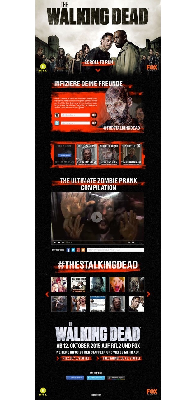 Initialzündung ist ein Video, das über die hauseigenen Facebook-Kanäle von Fox und RTL II abrufbar ist und über diverse Kanäle gestreut wird. Das Video führt auf die Microsite www.thestalkingdead.de, über die Twitter- und Instagram-User "infiziert" werden können. Die Infizierten werden schlagartig von einer Horde Zombie-Follower heimgesucht, die auf den Sendestart der neuen Staffeln "The Walking Dead" verweisen. Zudem finden die Fans auf der Microsite weitere spannende Inhalte zum Teilen.