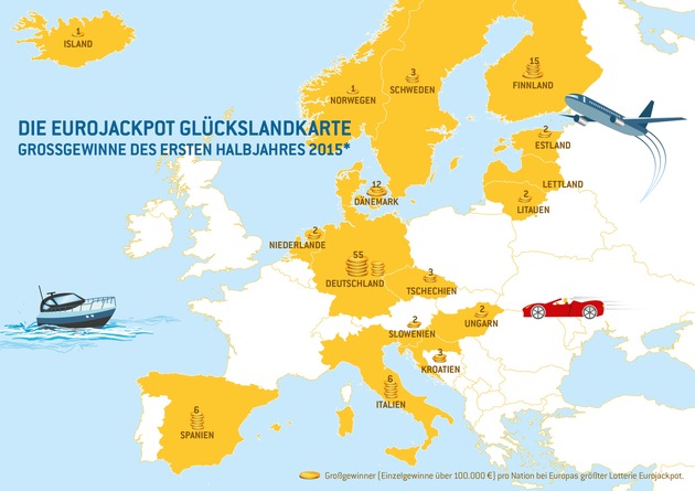 Das erste Halbjahr 2015 der Lotterie Eurojackpot stand ganz im Zeichen des Rekordjackpots von 90 Mio. Euro. Neben dieser bisher einmaligen Gewinnsumme gab es weitere zahlreiche Millionäre und Großgewinner, sowie millionenfache weitere Gewinner in den 16 teilnehmenden europäischen Ländern.