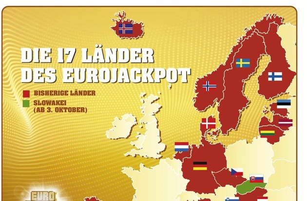 Mit der Slowakei haben zusätzliche 5,4 Mio. Menschen die Möglichkeit bei der Lotterie Eurojackpot mitzuspielen. Im Einzugsgebiet der Lotterie haben damit rund 269 Mio. Personen die Chance Millionär zu werden.