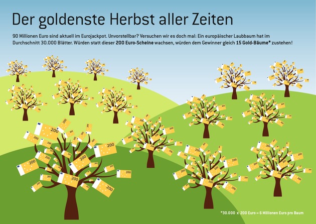 Andreas Kötter: In unserer aktuellen Bildwelt zum 90 Mio. Eurojackpot wachsen an den Bäumen keine Blätter mehr, sondern es fallen 200 Euro Scheine zu Boden... Wenn auch nicht ganz ernst gemeint. Mit diesem Bild soll die Dimension des 90 Mio. Eurojackpots verdeutlicht werden. Wir wünschen allen Tippern viel Erfolg und einen goldenen Herbst!