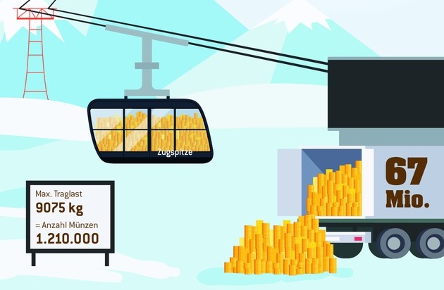 Denn in 1-Euro-Münzen umgerechnet, wären 56 Fahrten mit der Seilbahn an der Zugspitze notwendig, um den 67 Millionen Jackpot an die Bergspitze zu transportieren. Bei einem Gewicht von 7,5 Gramm pro Euro-Münze wären rund 1,21 Millionen Münzen pro Seilbahnfahrt denkbar. Zum Glück ist das aber nur eine Beispielrechnung.