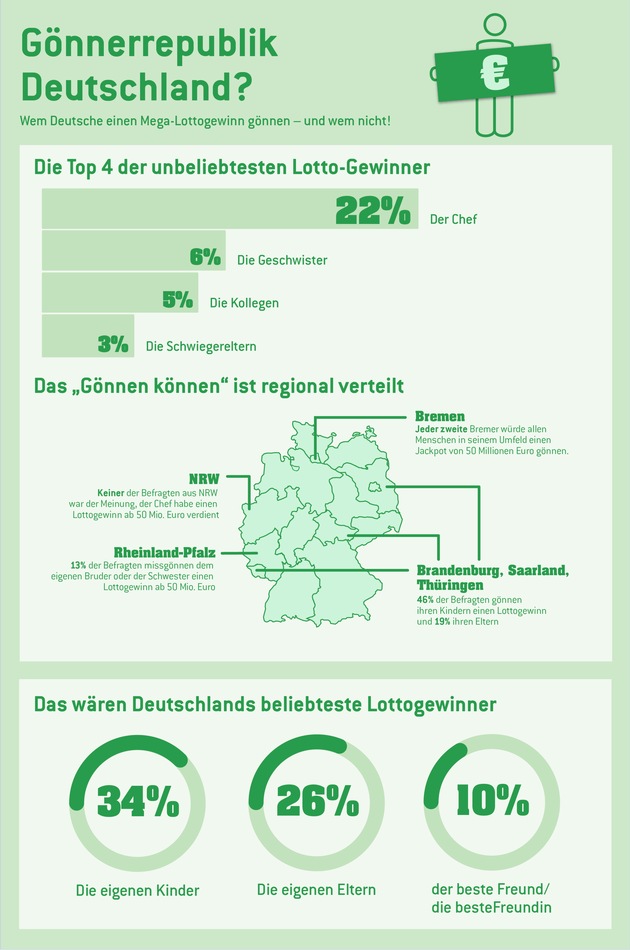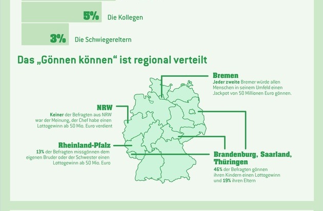 Die Gunst ist regional verteilt - einige Beispiele: - Keiner der Befragten aus NRW war der Meinung, der Chef habe einen Lottogewinn ab 50 Mio. Euro verdient. - In Brandenburg, Thüringen und im Saarland gönnt man den Kindern am ehesten ein Luxusleben: Während die Befragten in den anderen Bundesländern einen Lottogewinn ab 50 Mio. Euro ihren Kindern (32%) und Eltern (28%) gleichermaßen gönnen, freuen sich die Brandenburger, Thüringer und Saarländer mehr als doppelt so oft für ihre Kinder (46%) als für ihre Eltern (19%). - 13% der Befragten aus Rheinland-Pfalz missgönnt dem eigenen Bruder oder der Schwester einen Lottogewinn ab 50 Mio. Euro.