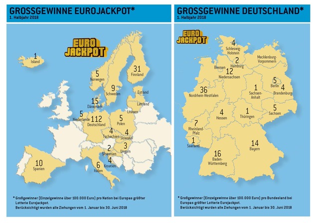 Über alle Gewinnklassen hinweg gibt es im ersten Halbjahr 2018 bisher rund 28,3 Millionen Einzelgewinne. Dahinter steht eine Gesamtgewinnsumme von rund 680 Millionen Euro. Seit dem Start der Lotterie vor mehr als sechs Jahren wurden rund 4,6 Milliarden Euro an die Eurojackpot-Spielteilnehmer als Gewinne ausgeschüttet.