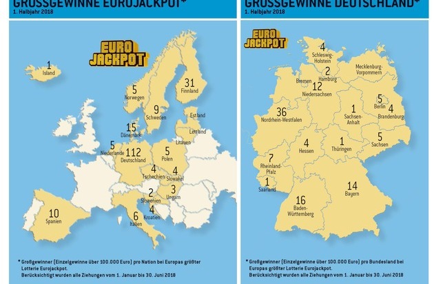Über alle Gewinnklassen hinweg gibt es im ersten Halbjahr 2018 bisher rund 28,3 Millionen Einzelgewinne. Dahinter steht eine Gesamtgewinnsumme von rund 680 Millionen Euro. Seit dem Start der Lotterie vor mehr als sechs Jahren wurden rund 4,6 Milliarden Euro an die Eurojackpot-Spielteilnehmer als Gewinne ausgeschüttet.
