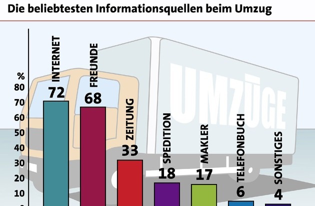 Die Mehrheit der Deutschen, die einen Umzug planen, informiert sich heutzutage online. Das ergab die Immostudie 2013, eine Untersuchung der Ludwig-Maximilians-Universität München. Demnach nutzen über 70 Prozent der Befragten das Internet als Informationskanal. Somit ist das Web mittlerweile noch gefragter als Familie und Freunde - diese werden von 68 Prozent der Befragten um Rat gebeten. Mehrfachnennungen waren möglich.