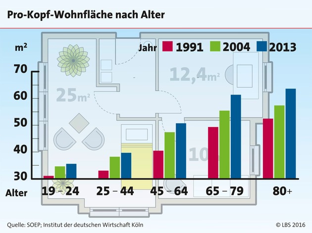 Mit der wachsenden Zahl der Einpersonen-Haushalte steigt laut einer Studie des Instituts der Deutschen Wirtschaft (IDW) auch die durchschnittliche Wohnfläche der Menschen. Hatte ein Bundesbürger 1991 durchschnittlich 36 Quadratmeter für sich zur Verfügung, sind es heute etwa 46. Bis zum Jahr 2030 werden es laut IDW im Durchschnitt voraussichtlich 54 Quadratmeter sein.