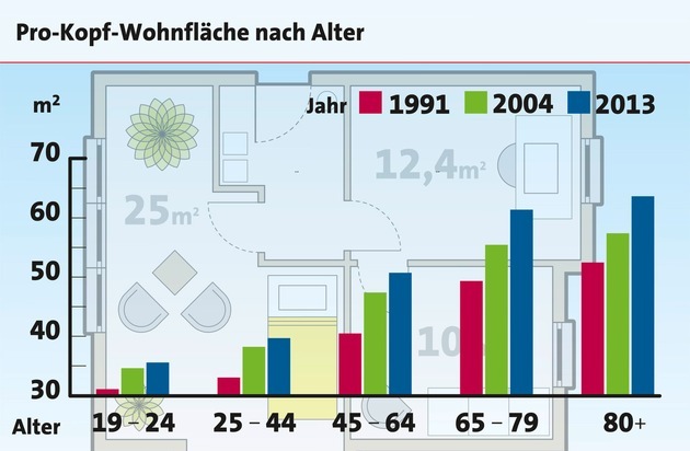 Wieviel Platz zum Wohnen jemand hat, hängt wesentlich von der persönlichen Lebenssituation und dem Alter ab. Ganz oben in der Statistik stehen auch hier die älteren Menschen: Im Durchschnitt beträgt die Pro-Kopf-Wohnfläche eines über 80-Jährigen heute fast 64 Quadratmeter, während sich ein 19- bis 24-Jähriger mit gut der Hälfte begnügen muss. Der Grund: Mit zunehmendem Alter steigen Einkommen und Wohlstand und so können sich die Menschen auch mehr Wohnraum leisten. Häufig gründen sie eine Familie und benötigen deshalb mehr Platz. Sind die erwachsenen Kinder dann später aus dem Haus oder ist der Ehepartner womöglich bereits verstorben, möchten die meisten Menschen - gerade im Alter - am liebsten in ihrer gewohnten Umgebung bleiben. Aus der Wohnung oder dem Haus auszuziehen, kommt für viele nicht in Frage.