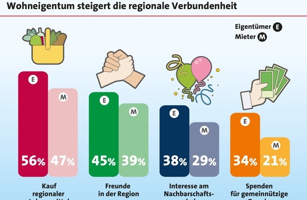 Zudem haben ein eigenes Haus oder eine eigene Wohnung positive Auswirkungen auf das gesellschaftliche Zusammenleben. So fühlen sich 64 Prozent der Immobilienbesitzer sehr verbunden mit der Region, in der sie leben. Bei den Mietern ist es knapp die Hälfte. Diese regionale Verbundenheit äußert sich etwa darin, dass Wohneigentümer mehr regionale Lebensmittel kaufen. Sie haben mehr Freunde in der Region, kümmern sich häufiger um die Geschehnisse in der Nachbarschaft und ihre Spendenbereitschaft für gemeinnützige Zwecke ist höher.