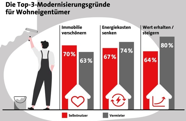 Konkret plant zwar fast jeder zweite der Befragten in den kommenden drei Jahren eine Modernisierung - meist, um die Wohnqualität oder den Immobilienwert zu verbessern und die Energiekosten zu senken. Allerdings gibt es dabei große Altersunterschiede: Bei den unter 50-Jährigen sind es deutlich mehr als die Hälfte, ab 60 Jahren nur noch gut ein Drittel, jenseits der 70 Jahre gerade noch ein Viertel.
