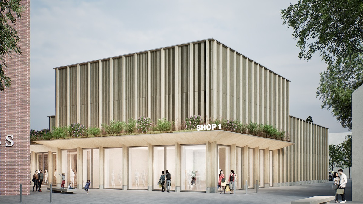 Die neuen Shopflächen zeichnen sich durch großzügige Schaufenster und einladende Eingangsbereiche aus. Im Inneren sind sie flexibel teilbar und ermöglichen unterschiedliche Nutzungs- und Flächengrößen. Die Eingangsbereiche werden durch ein rund 1,50 Meter auskragendes Vordach betont und erhalten eine witterungsgeschützte Vorzone, die die Aufenthaltsqualität zusätzlich steigert.