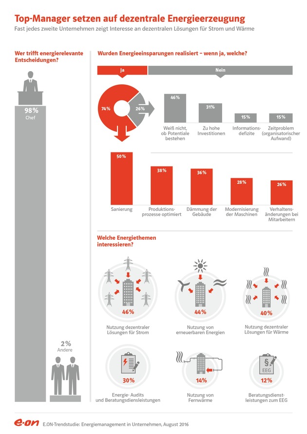 Wichtigste Maßnahmen für jedes zweite Unternehmen waren die Sanierung von Heizungen und der Einbau effizienterer Beleuchtungen. Gut jedes dritte Unternehmen hat seine Produktionsprozesse optimiert. Ebenso viele Firmen haben ihre Gebäude gedämmt. "Energie und Klimaschutz haben einen festen Platz auf der Agenda deutscher Unternehmen", bestätigt Heinz Rosenbaum, Geschäftsführer E.ON Energie Deutschland. "Es gibt aber noch erhebliches Verbesserungspotenzial, insbesondere in den Bereichen Eigenerzeugung und Speicher."