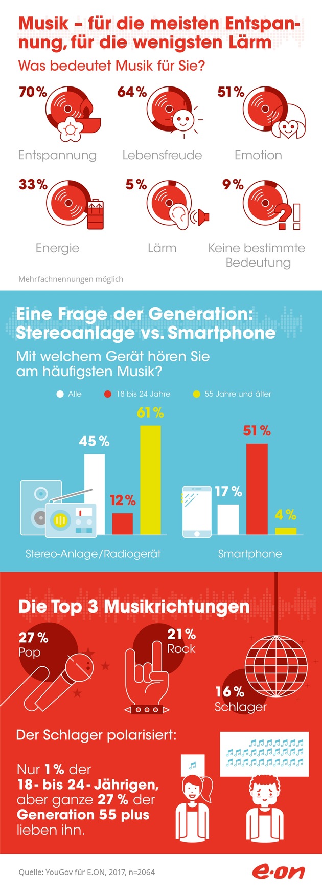 SmartphoneJedes Jahr ruft der Deutsche Musikrat am dritten Juniwochenende zum "Tag der Musik" auf, um die Vielfalt und den kulturellen Stellenwert der Musik in Deutschland zu betonen. Dieses Mal stehen die zahlreichen Veranstaltungen vom 16. bis 18. Juni, die im ganzen Bundesgebiet stattfinden, unter dem Motto "Orchestergipfel". Doch was bedeutet Musik ganz konkret für die Deutschen? Vor allem Entspannung und Lebensfreude, wie eine repräsentative Umfrage von YouGov im Auftrag des Energieanbieters E.ON ergab. 70 bzw. 64 Prozent der 2.000 Befragten ordneten der Musik diese Attribute zu (Mehrfachnennungen möglich). Knapp die Hälfte verbindet Musik zudem mit Emotion, ein Drittel gewinnt aus ihr neue Energie.