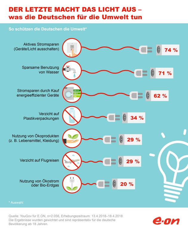 Bei der Umfrage wurde unter anderem auch danach gefragt, mit welchen Verhaltensweisen die Deutschen die Umwelt noch schützen. Ganz an erster Stelle steht übrigens aktives Stromsparen, zum Beispiel durch energieeffiziente Geräte oder Licht ausschalten: Drei Viertel aller Deutschen spart so Energie. Das geht übrigens auch gut im Urlaub durch drei ganz einfache Maßnahmen: Den Kühlschrank während des Urlaubs ausschalten und abtauen lassen. Das spart nicht nur Energie während der Abwesenheit, sondern auch nach der erneuten Inbetriebnahme. Denn sowohl Kühl- als auch Gefrierschrank verbrauchen weniger, wenn durch das Abtauen eventuell vorhandene Eisrückstände entfernt werden. Ein weiterer Tipp: Alle Geräte (auch die auf Standy-By) ausschalten. Fernseher, DVD-Player, Sat-Receiver oder Computer laufen oft munter auf Stand-by weiter, so lange sich das Kabel in der Steckdose befindet. Gleiches gilt für Notebooks, Radiowecker, Deckenfluter oder Akkuladegeräte, die ein separates Netzteil haben. Bevor es in die Ferne geht, lohnt sich also ein Rundgang durch die Wohnung, bei dem man den Stecker zieht oder die Steckerleiste ausschaltet.