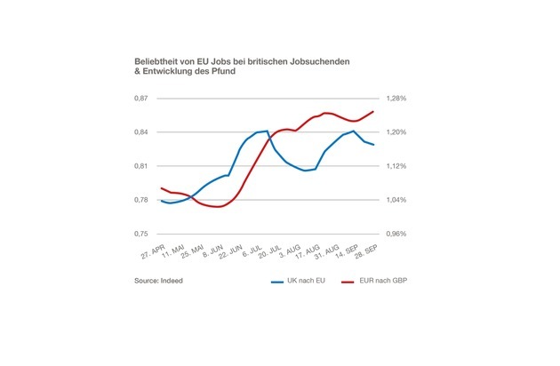 Die Anzahl der Briten, die im Ausland nach Jobs sucht, ist derzeit auf dem gleichen hohen Niveau wie unmittelbar nach dem Referendum. Dies zeigen neue Daten der weltweit größten Jobseite Indeed. Die Analyse von Millionen von Jobsuchen aus Großbritannien belegt auch, dass Briten sich zunehmend für Arbeit in anderen EU-Ländern interessieren seit der Euro sich immer stärker im Vergleich zum Pfund entwickelt. Das Pfund erreichte am letzten Freitag den niedrigsten Wert zur Gemeinschaftswährung seit fünf Jahren. Dies könnte ein Beleg dafür sein, dass die Briten der eigenen Wirtschaft und deren Zukunftsaussichten weniger vertrauen und sich stattdessen anderweitig orientieren.