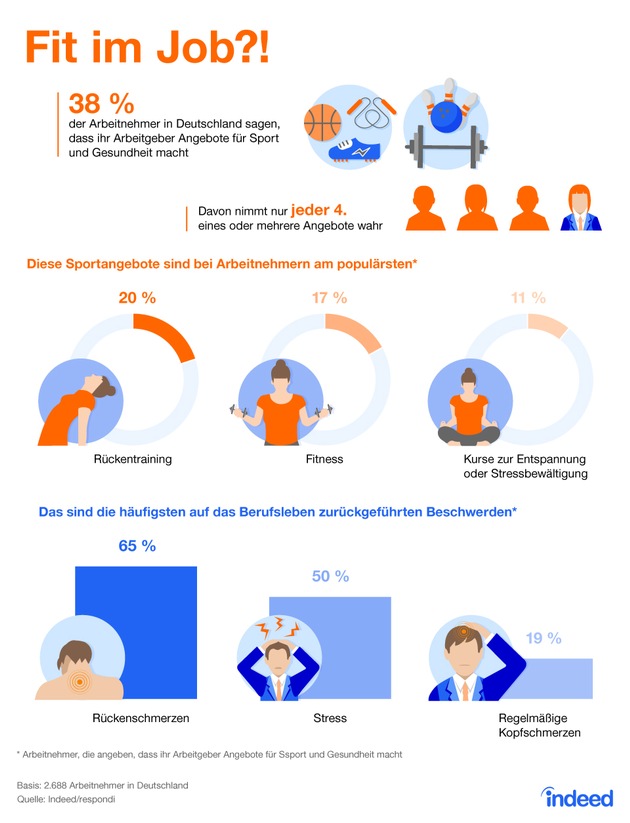 Indeed hat im Oktober 2017 2.688 Arbeitnehmer in Deutschland befragt, ob ihr Arbeitgeber Sport-/Gesundheitsangebote macht. 4 von 10 Arbeitnehmern (38,09%) haben dies bejaht. Die Auswertung basiert auf den Ja-Antworten.