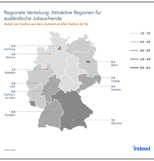 Bei den Städten liegen die Metropolen vorne: Nach Berlin sind München und Frankfurt bei Jobsuchenden aus dem Ausland am beliebtesten. Die letztgenannten zwei Städte sind dabei gefragter als die zugehörigen Bundesländer Bayern und Hessen insgesamt. Umkehrschluss: Viele andere Städte in Bayern und Hessen erfreuen sich somit einer wesentlich geringeren Beliebtheit bei ausländischen Jobinteressenten.