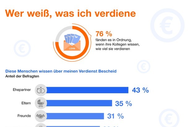 Wer weiß, was Sie verdienen? Mein Ehe-Partner: 43 Prozent Mein Partner (wenn nicht verheiratet): 28 Prozent Meine Eltern: 35 Prozent Meine Freunde: 30 Prozent Meine Arbeitskollegen: 29 Prozent Meine Kinder: 17 Prozent Niemand - nur mein Vorgesetzter und ich: 11 Prozent