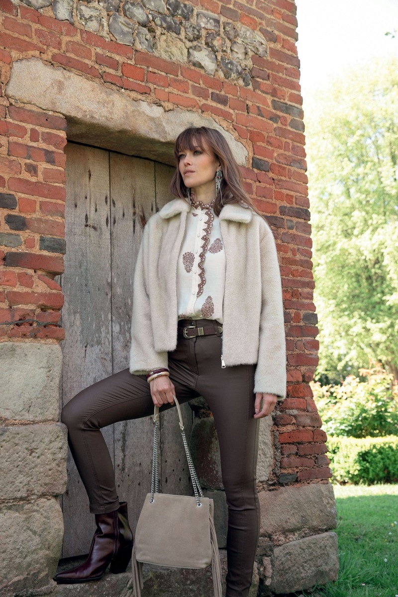 Die Blusen und Hemden der Kollektion überraschen mit Krawattenkragen, Indianermustern, Stickereien oder Lochmustern in Khaki und Schwarz. Auch Rüschenblusen mit Schoko-Print sowie viktorianisch inspirierte Designs verleihen dem Herbstlook eine elegante Note.