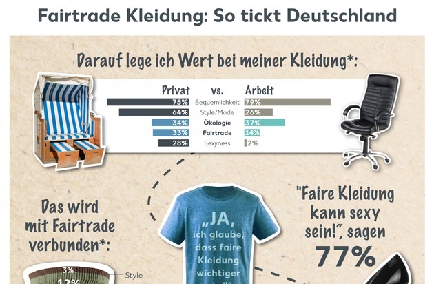 Zwar glauben 63 Prozent der Deutschen, dass soziale, ökologische und ökonomische Kriterien beim Herstellungsprozess zukünftig immer wichtiger werden, doch nur eine Minderheit handelt auch entsprechend. So achtet nur ein Drittel der Deutschen (33 Prozent) beim Kauf privater Kleidung darauf, ob diese fair gehandelt wurde. Noch geringer fällt das Kriterium Fairtrade bei der Arbeitskleidung ins Gewicht. Fragt man nach den wichtigsten Faktoren, belegt die Bequemlichkeit der Kleidung Rang eins (79 Prozent). Platz zwei (37 Prozent) nimmt die ökologische Herstellung (z.B. giftstofffreie Textilien) ein, gefolgt von einem modischen und stylischen Schnitt (26 Prozent). Den Anspruch, dass Arbeitskleidung fair gehandelt sein soll, haben lediglich 14 Prozent der Deutschen.