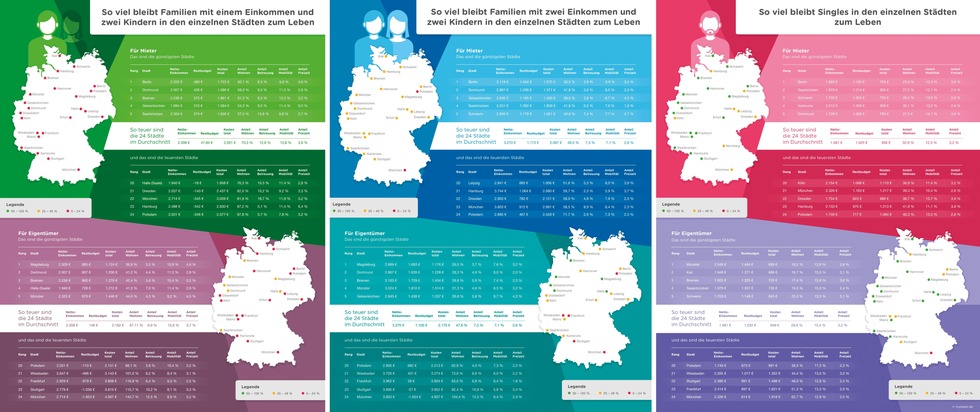 Immerhin können sich Singles mit durchschnittlichem Einkommen das Leben in allen 24 Städten leisten. Auf Familien mit einem Mittleren Einkommen trifft dies nicht unbedingt zu. Grund sind die hohen Kosten. Diese summieren sich in Städten wie Stuttgart (2.794 Euro), Wiesbaden (2.669 Euro), Köln (2.550 Euro), Erfurt (2.119 Euro), Halle (2.056 Euro), Leipzig (2.117 Euro), Dresden (2.273 Euro) und Hamburg (2.811 Euro) auf Beträge, die das monatliche Einkommen teils deutlich übersteigen. Am teuersten lebt es sich für Familien mit einem Gehalt in München und Potsdam. 3.129 Euro müssten Familien mit einem Einkommen und zwei Kindern in München zum Leben aufbringen, 415,25 Euro mehr als sie einnehmen. In Potsdam steht nach Abzug aller Kosten sogar ein Fehlbetrag von 538,61 Euro unterm Strich. Günstig ist das Leben für Familien mit einem Einkommen in Berlin. Nach Abzug aller Kosten verbleiben 479,91 Euro und damit 21,8 Prozent des Einkommens in den Taschen der Beispielfamilie. Auf Rang zwei liegt Gelsenkirchen (16,4 Prozent, 310 Euro), auf Rang drei Dortmund (15,4 Prozent, 309 Euro).