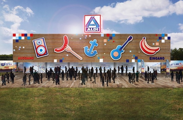 Eine riesige Außenfassade, bunte Dekoelemente und darauf ein beleuchteter ALDI Würfel - so wird der XXL ALDI beim diesjährigen DEICHBRAND Festival in Cuxhaven-Nordholz aussehen. ALDI Nord ist erstmals mit einer 2.100 Quadratmeter großen Filiale vor Ort und versorgt die 55.000 erwarteten Festivalbesucher vom 19. bis 23. Juli mit Lebensmitteln, Getränken und Festivalequipment.