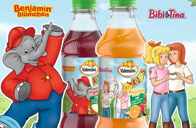 Die neuen Valensina KIDS Fruchtmixe enthalten nur reinen Fruchtsaft in Verbindung mit Wasser. Mit der natürlichen Rezeptur ohne jeden Zusatz kann Valensina KIDS den klassischen Durstlöscher Wasser optimal ergänzen. Die praktische Flasche mit Sportscap-Verschluss begleitet Kinder unkompliziert durch den Tag. Der frische, natürliche Geschmack und die beliebten Lizenzfiguren* "Benjamin Blümchen" und "Bibi & Tina" sorgen für viel Spaß und stellen sicher, dass Kinder das Trinken nicht vergessen.