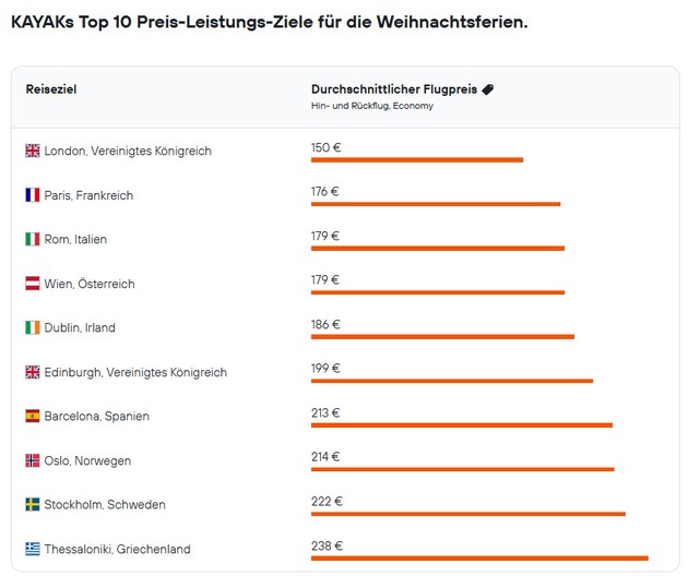 *Die Daten basieren auf Flugsuchen, die auf KAYAK.de und den dazugehörigen Marken im Zeitraum vom 15.06.2025 bis 10.09.2025 durchgeführt wurden - für Flüge mit Abflug zwischen dem 20.12.2025 und 02.01.2026 und Rückflug zwischen dem 25.12.2025 und 10.01.2026, ab allen deutschen Flughäfen. Diese Daten wurden mit Suchanfragen aus dem Zeitraum vom 15.06.2024 bis 10.09.2024 verglichen, die Flüge mit Abflug zwischen dem 21.12.2024 und 03.01.2025 und Rückflug zwischen dem 25.12.2024 und 11.01.2025 betrafen. Alle Flugpreise beziehen sich auf den durchschnittlichen Preis für Hin- und Rückflüge in der Economy Class. Preise können variieren; Prozentangaben zu Veränderungen bei Suchen und Preisen sind annähernd.