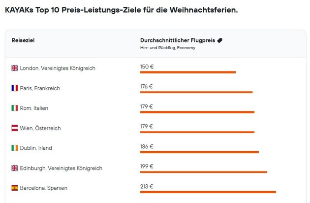 "Die Top Ten der Schnäppchen-Ziele in den Weihnachtsferien führen zweifellos europäische Hauptstädte an", sagt Yvonne Bonanati von KAYAK. "Besonders Fans von Städtereisen kommen so auf ihre Kosten. Wer sich zum Beispiel schon immer gewünscht hat, einmal die Weihnachtsfeierlichkeiten im Petersdom zu erleben, der kann sich in diesem Jahr sogar noch über günstigere Ticketpreise in der Weihnachtszeit nach Rom freuen."