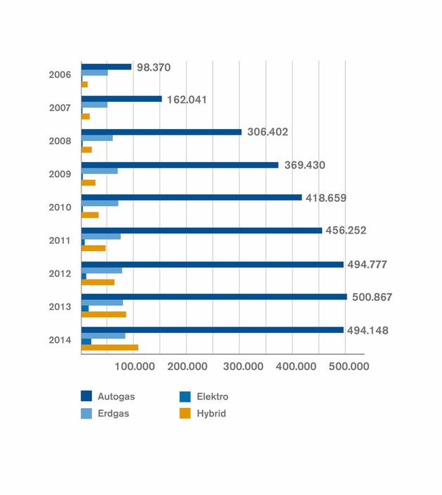 Mit knapp 500.000 zugelassenen Autogas-Fahrzeugen (Stand Januar 2015) besetzt der Alternativkraftstoff Nr. 1 etwa 70 Prozent des Marktes alternativer Antriebe in Deutschland. Hybrid- (15 Prozent) sowie Erdgas-Fahrzeuge (12 Prozent) folgen vor dem Schlusslicht Elektromobilität (3 Prozent). Alternative Kraftstoffe stellen insgesamt 1,6 Prozent des PKW-Bestands in Deutschland.