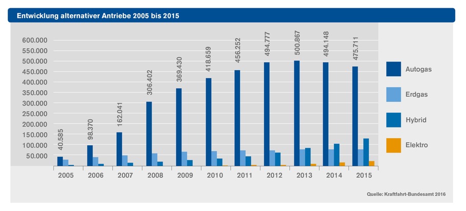 Autogas war auch 2015 der weitverbreitetste Alternativkraftstoff in Deutschland: Am 1. Januar 2016 waren 475.711 Fahrzeuge mit dem Kraftstoff Autogas zugelassen. Nach den Zahlen des Kraftfahrt-Bundesamtes folgen die weiteren alternativen Antriebe wie Hybrid (130.365), Erdgas (80.300) und Elektro (25.502) mit großem Abstand der Nr.1 Autogas. Damit besetzen Autogas-Fahrzeuge etwa 70 Prozent des Marktes alternativer Fahrzeuge. Insgesamt stellen alternative Antriebe 1,6 Prozent des PKW-Bestands in Deutschland.
