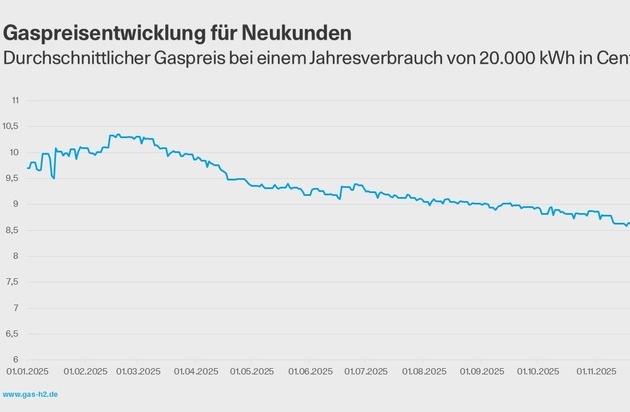Zum Jahresbeginn 2025 lagen die Gaspreise für Neukunden zeitweise bei gut 10 Cent pro Kilowattstunde (Höchstwert Mitte Februar bei 10,35 ct/kWh). Seit April bewegen sich die Preise kontinuierlich unterhalb dieser Marke und liegen nach Daten des Vergleichsportal Verivox aktuell bei knapp unter 8 Cent je Kilowattstunde (niedrigster Wert 24.12. bei 7,99 ct/kWh). Insgesamt ist der Gaspreis seit Jahresbeginn um etwa 1,9 Cent pro Kilowattstunde gesunken, was einem Rückgang von etwa 19 Prozent entspricht und die Verbraucherinnen und Verbraucher spürbar entlastet.