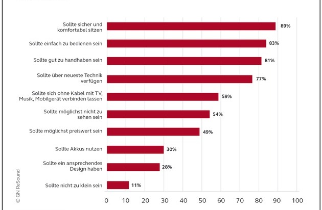 Befragt danach, welche Kriterien für die Hörgeräte ihrer Wahl entscheidend seien, nannten die Probanden insbesondere einen komfortablen Sitz (89 Prozent), einfache Bedienung (83 Prozent), gute Handhabung (81 Prozent) sowie neueste Technik (77 Prozent). Auf Rang fünf der wichtigsten Auswahlkriterien folgte bereits die Hörgeräte-Vernetzung. 59 Prozent der Probanden war wichtig, dass sich die Wunsch-Hörgeräte ohne Kabel mit TV, Musik oder Mobilgerät verbinden lassen. Die neuartigen Möglichkeiten der Konnektivität rangierten somit noch vor den traditionell starken Wünschen von Hörgeräte-Kunden: Möglichst unsichtbare Hörgeräte wünschten sich 54 Prozent der Befragten; 49 Prozent war es wichtig, dass ihre Hörgeräte möglichst preiswert sind.