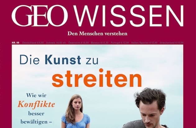 GEO WISSEN "Die Kunst zu streiten" (Nr. 59) erscheint heute, hat einen Umfang von 164 Seiten und kostet 9,50 Euro. Das Heft inklusive DVD "Gelassenheit lernen: Wie Meditation uns hilft, besser mit Konflikten umzugehen" ist für 16,50 Euro erhältlich.