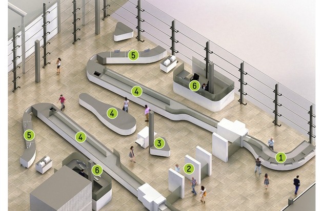 Künftig können bis zu fünf Fluggäste gleichzeitig ihre Gepäckwannen am Band befüllen und individuell auflegen. Vorteil: Wer als Passagier gut auf die Kontrollen vorbereitet ist und seine Gegenstände im Handgepäck griffbereit hat, spart wertvolle Zeit. Wer hingegen mehr Zeit oder auch Unterstützung benötigt, kann diese stressfrei in Anspruch nehmen. Ziel ist ein gleichmäßiger Zulauf von zu kontrollierendem Gepäck, das konstant durch eine Röntgenanlage läuft und durch mehrere Auswerter überprüft wird, während die Fluggäste selbst mithilfe der neuesten Generation der Sicherheitsscanner kontrolliert werden.