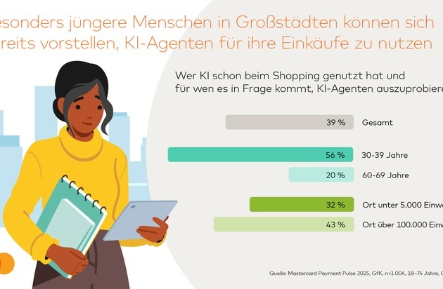 Die Mehrheit der Deutschen bezahlt schon heute digital und kontaktlos, jede:r Dritte (34 %) hat in den vergangenen 12 Monaten Smartphone oder Smartwatch an der Kasse genutzt. Künftig wird sich Shopping noch stärker in Richtung innovativer Technologien und künstlicher Intelligenz (KI) entwickeln. Das zeigt die repräsentative GfK-Studie Mastercard Payment Pulse 2025, die im siebten Jahr in Folge aktuelle Bezahltrends in Deutschland untersucht. Schon heute haben laut GfK-Daten 39 % der Konsument:innen KI beim Shopping genutzt oder können sich vorstellen, Einkäufe im Netz durch KI-Agenten erledigen zu lassen. Unter den 30- bis 39-Jährigen steigt dieser Wert auf mehr als die Hälfte (56 %), in Berlin sogar auf 61 %.