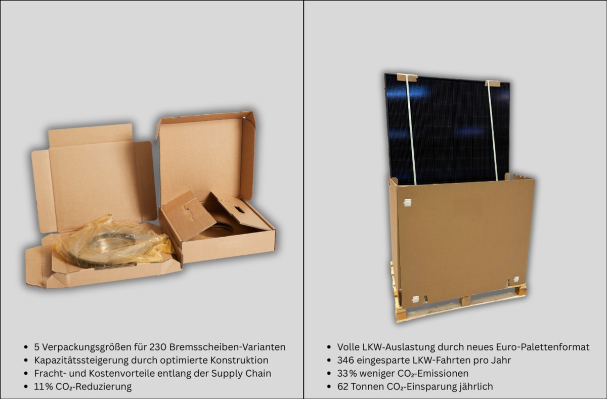 Im Automotive-Umfeld führte eine neu entwickelte Bremsscheiben-Industrieverpackung zu einer Standardisierung der Verpackungsgrößen und einer Kapazitätssteigerung pro Karton. Mit der neuen Lösung können nun 230 verschiedene Bremsscheiben in nur 5 Verpackungsgrößen sicher versandt werden. Ergänzend zu dieser Standardisierung der Verpackungsmaterialien führte diese Optimierung zu Frachtvorteilen und damit zu einer CO2-Reduzierung von 11 Prozent. Die innovative Verpackung entfaltet entsprechend hohe Kostenreduzierungen entlang der gesamten Lieferkette.